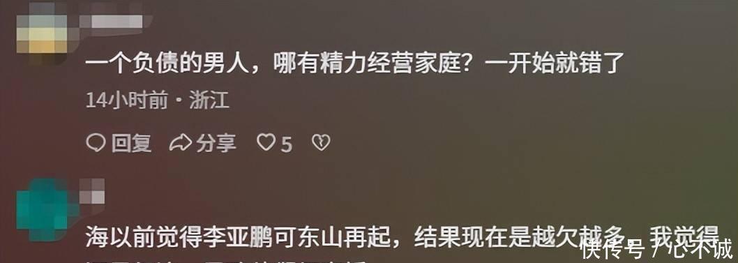 有颇具名气的博主针对他们二人的离婚问题展开了分析,推测极有可能是女方主动提出的,毕竟当下的生活状态和独自一人生活并无显著差异。无论是作为丈夫,亦或是作为父亲,好像都未履行陪伴的责任。并且,这几乎不可能是由于债务方面的缘由,毕竟两人在2022年步入婚姻殿堂时,就已然知晓李亚鹏存在债务问题。